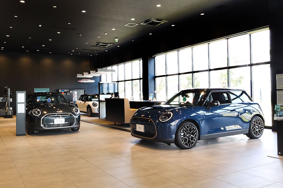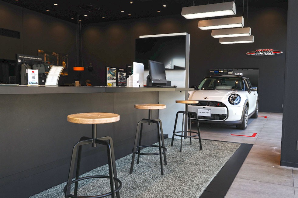 東海地域最大の面積を誇るMINI豊橋は、最新CIに基づくブラックを基調とした内外装を施し新車5台を常設展示。また最新CI設備の商談エリアとMINI HUB(ハブ)を配備したショールームでは、新車お引き渡し専用スペースであるハンドオーバーエリアなどを設置しています。